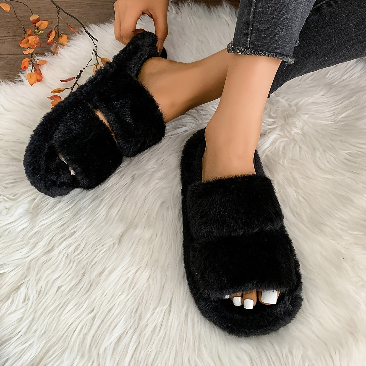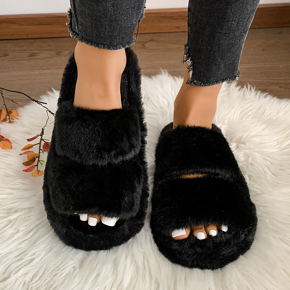 Ayollar uchun plüsh nordik uslubdagi uy ichki poyabzali, ochiq barmoqli, qora, oq, bej, pushti