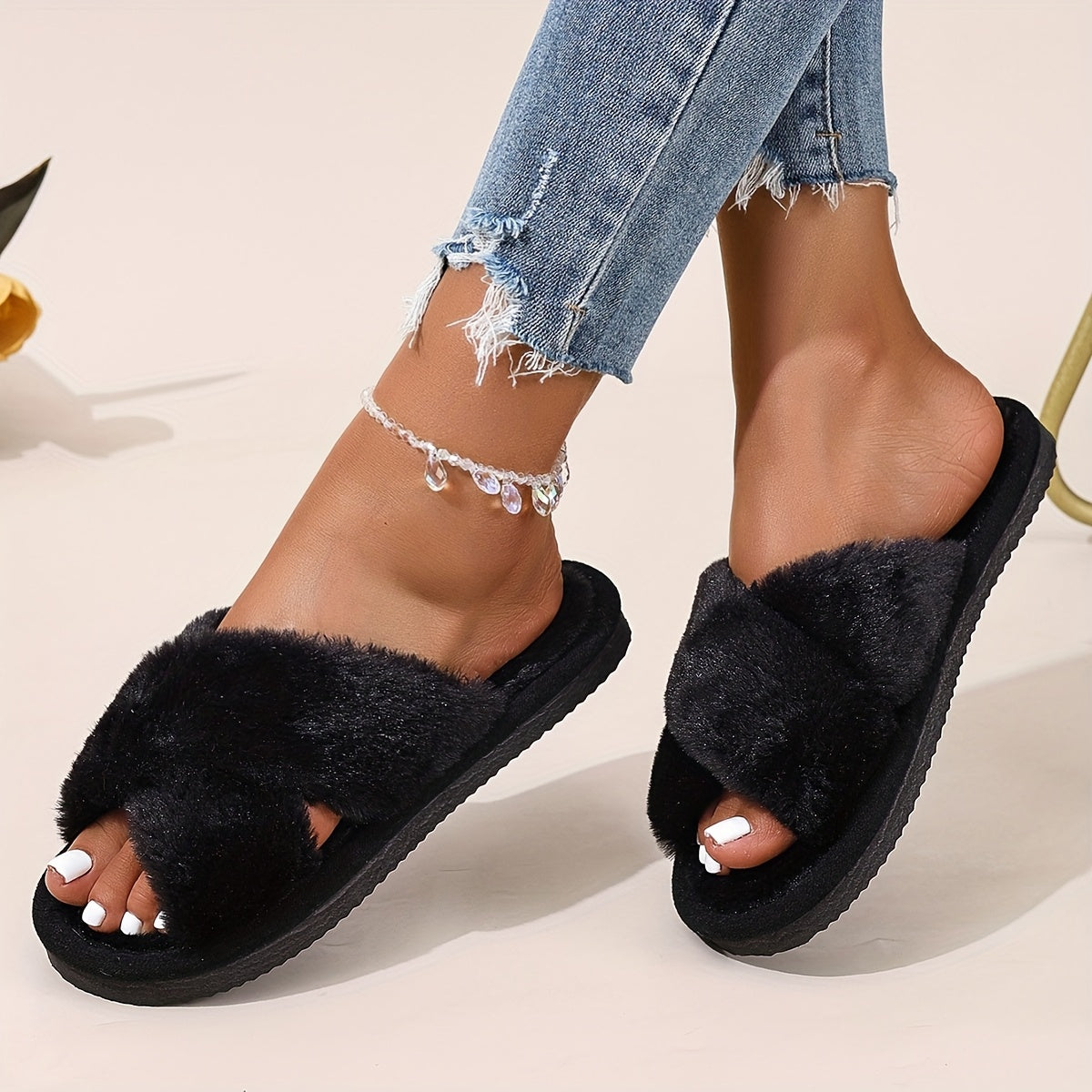Ayollar uchun plüshli yopiladigan shippaklar, o'qli kamar, sun'iy jun, kulrang ichki va tashqi foydalanish uchun