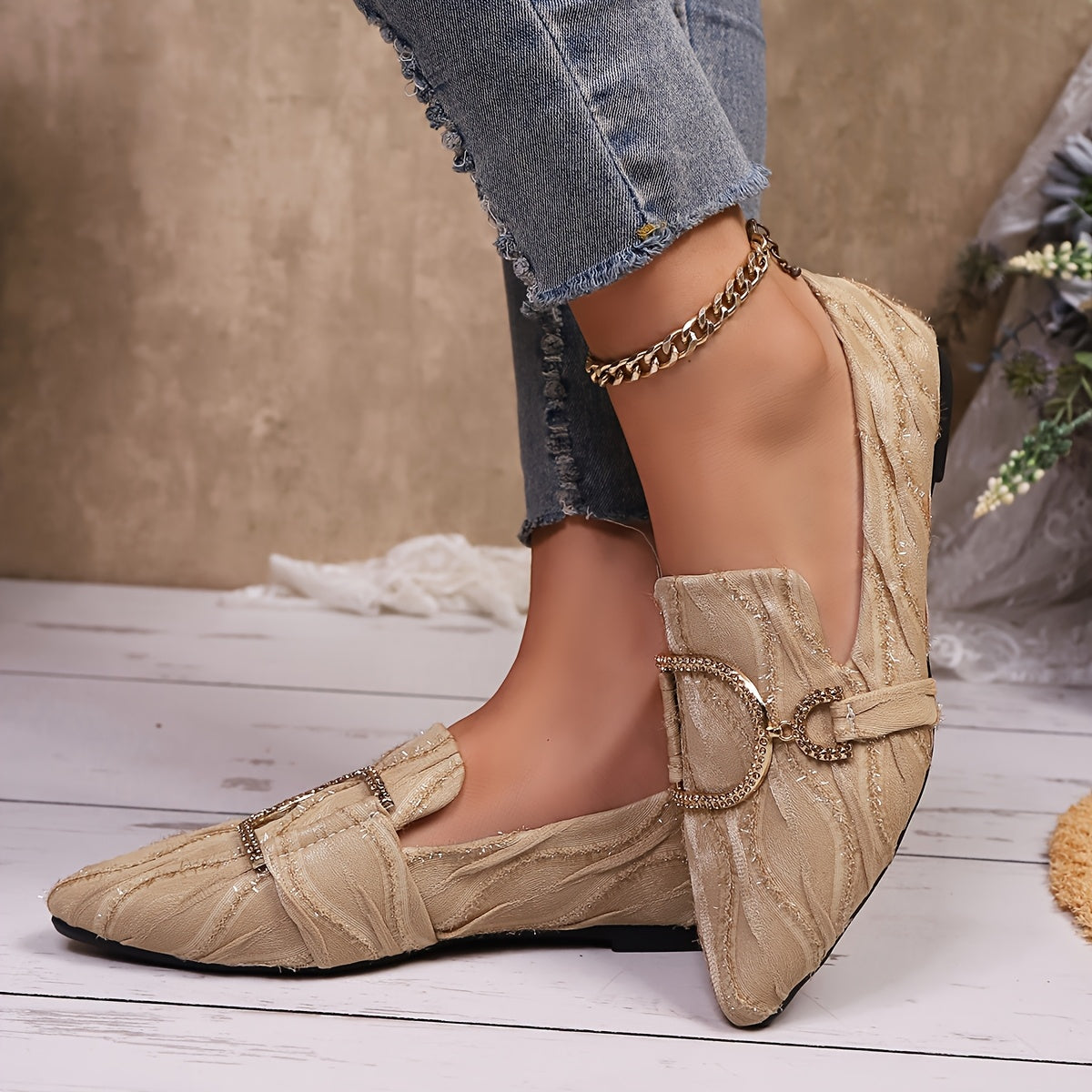 Ayollar uchun rhinestone metall zanjirli slip-on mokasinlar bej rangli, yopishqoqsiz kauchuk tagli