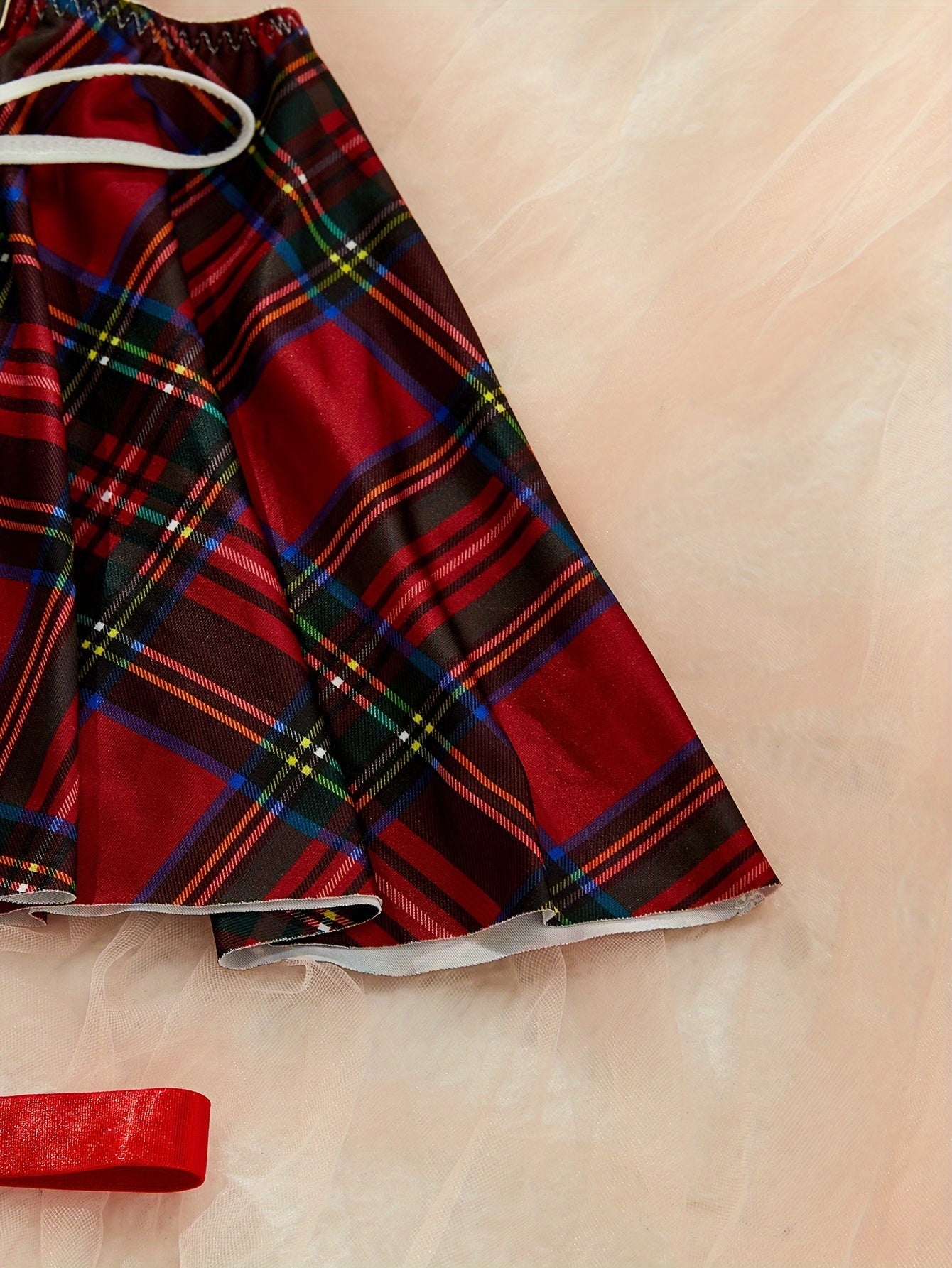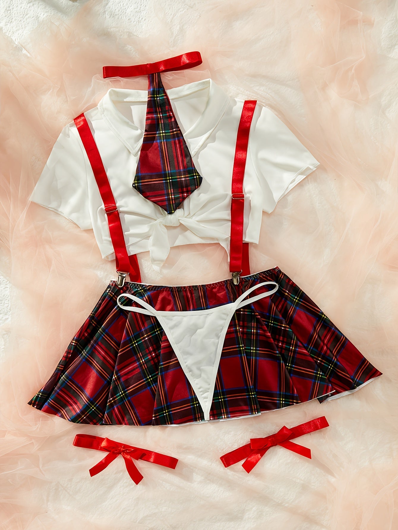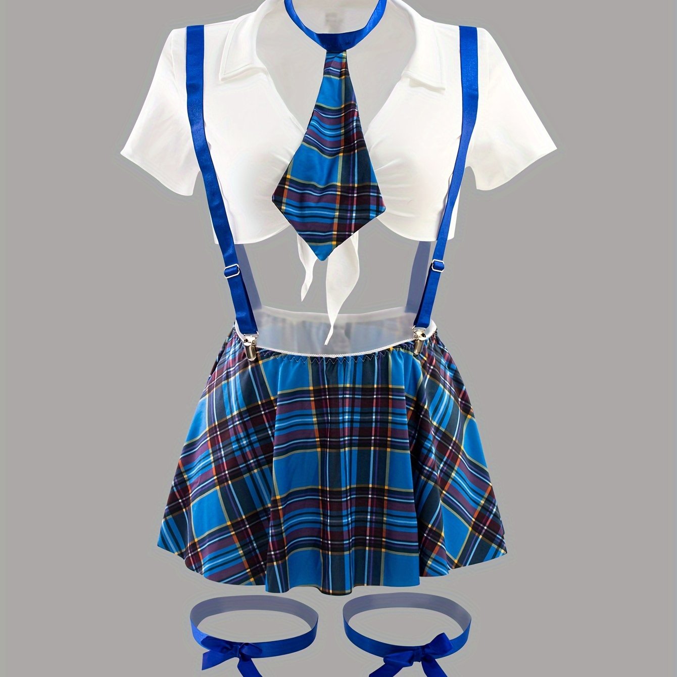 Ayollarning jozibali kollej rol o'ynash kostyum to'plami qisqa yubka, thong, yuqori, kamon bog'ich va oyoq halqasini o'z ichiga oladi.