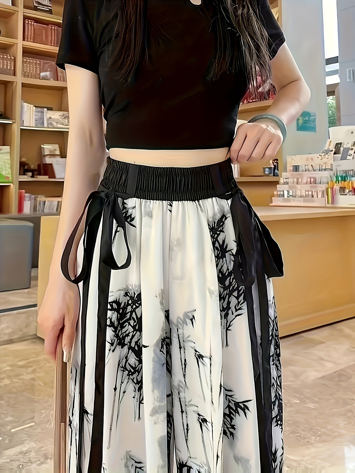 Ayollar uchun keng oyoqli shimlar, o'simlik naqshiga ega va bog'ichli cho'ntaklar bilan, polyester aralashmasidan tayyorlangan, kattalar o'lchamida va yoz/kuz mavsumi uchun tasodifiy uslubda.