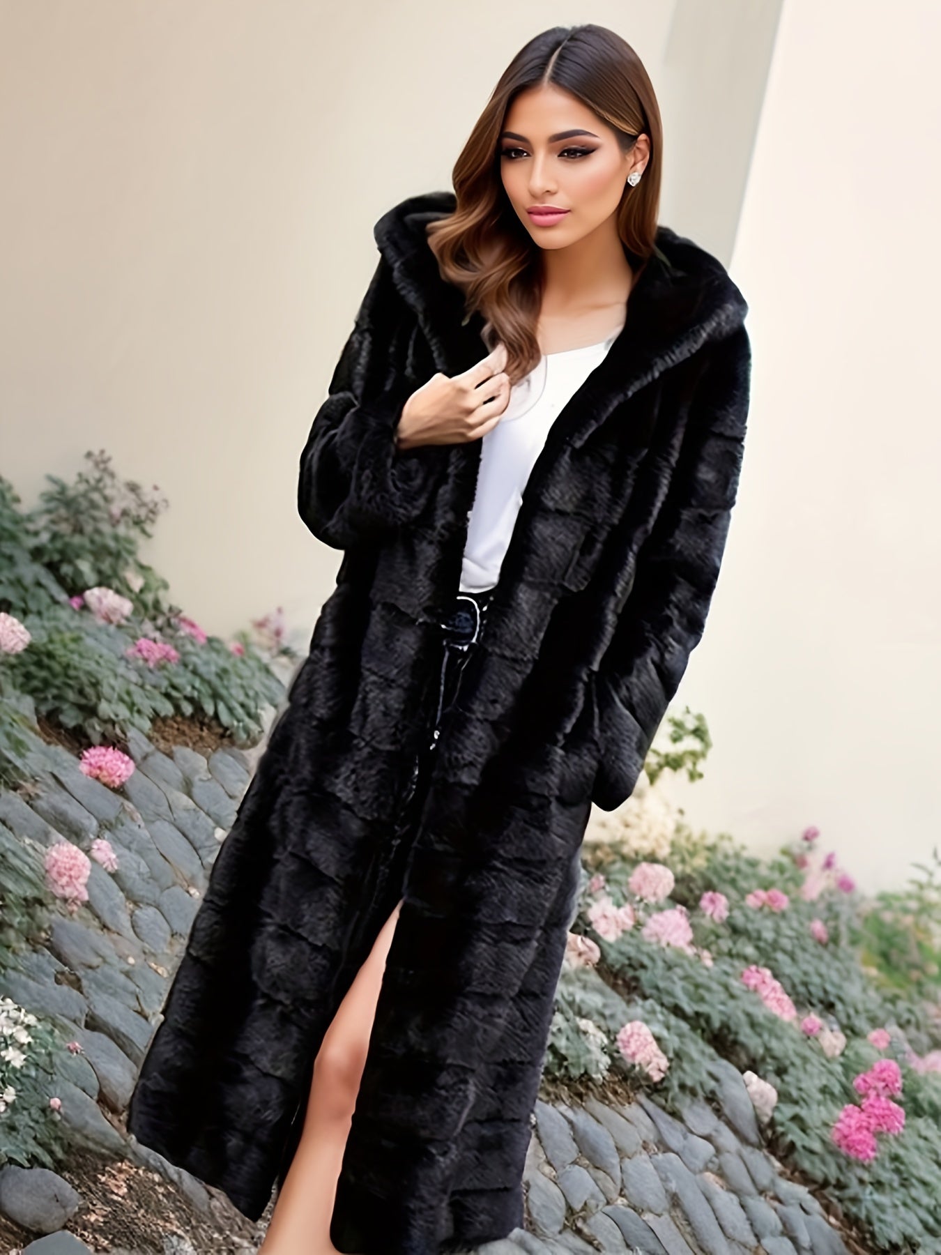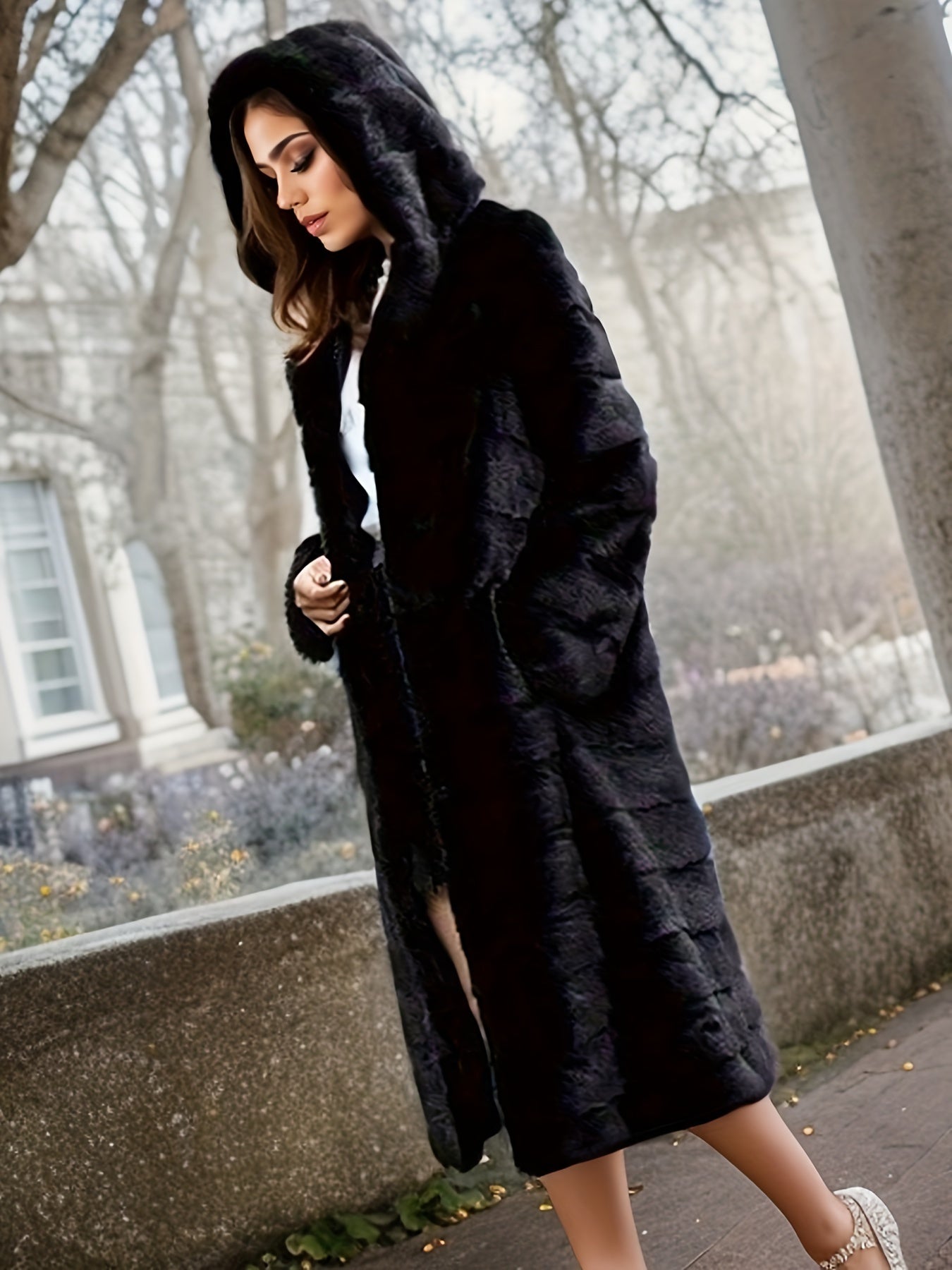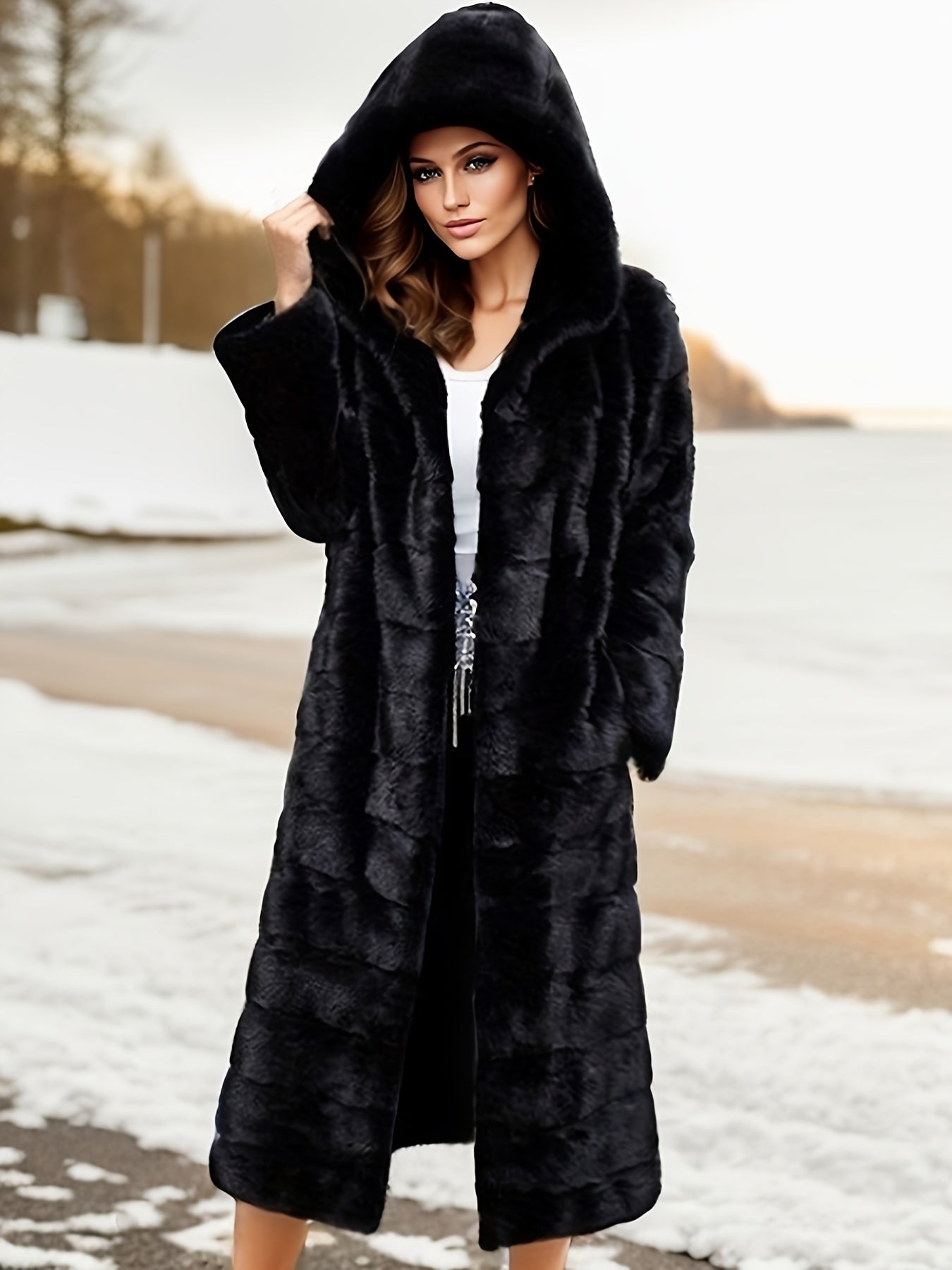 Ayollar uchun qish palto, sun'iy qo'y terisi kapyushi va sun'iy suv minki junidan tayyorlangan, ingichka fit, uzun kapyush va iliqlik uchun yumshoq qora sun'iy minki materialiga ega.