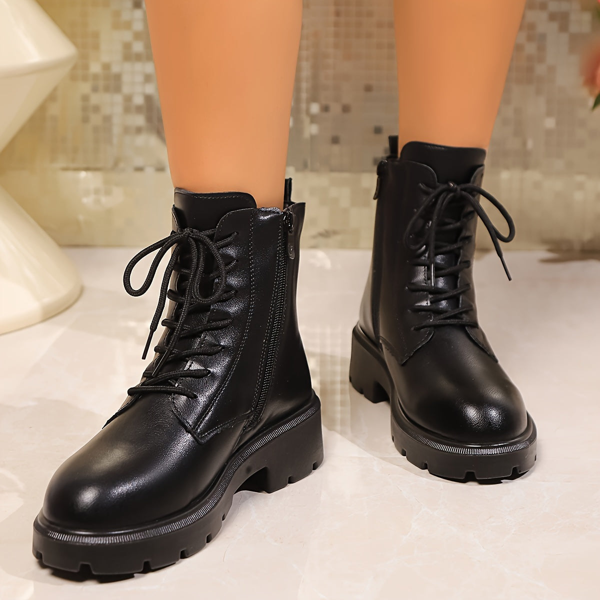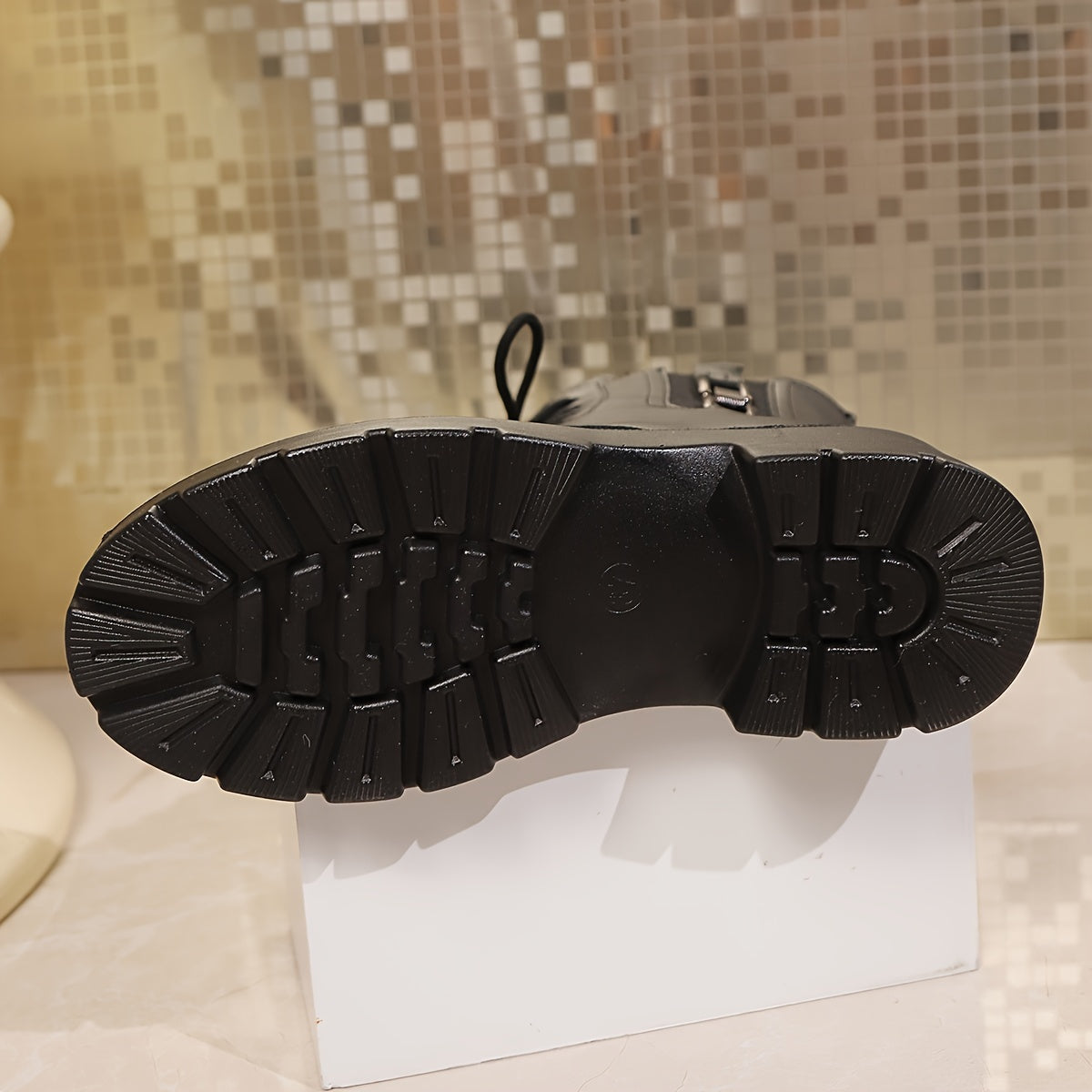 Ayollar uchun qishki sun’iy charmli yopishqoqsiz, oddiy, tizzaga qadar bo‘lgan botinkalar, zippersiz