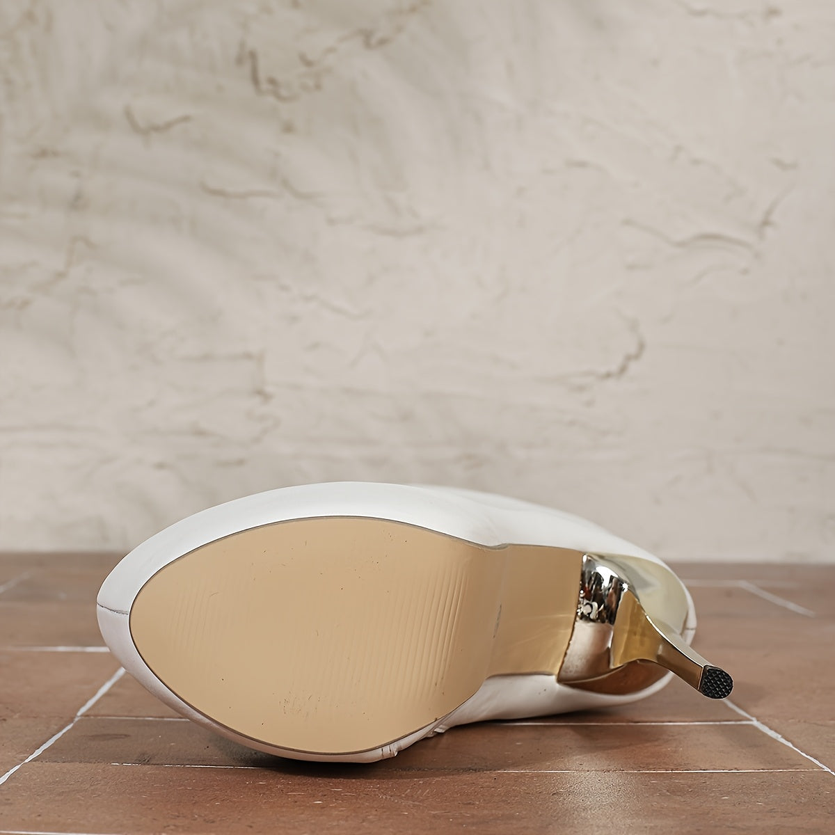 Ayollar uchun oq bo‘yi yuqori botlar, 17 sm stiletto poyabzal va zippersiz