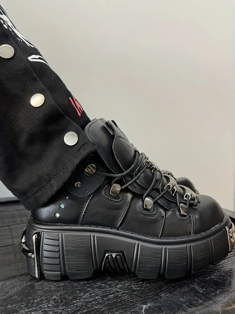 Y2K uslubidagi punk rok platforma krossovkalari, bir rangli bog'ichli ankle botinkalar bilan. Qalin taglik va sirpanmaydigan kauchuk taglikka ega qulay pastki doira botiq. Har mavsumga mos mato bilan qoplangan poyabzal.