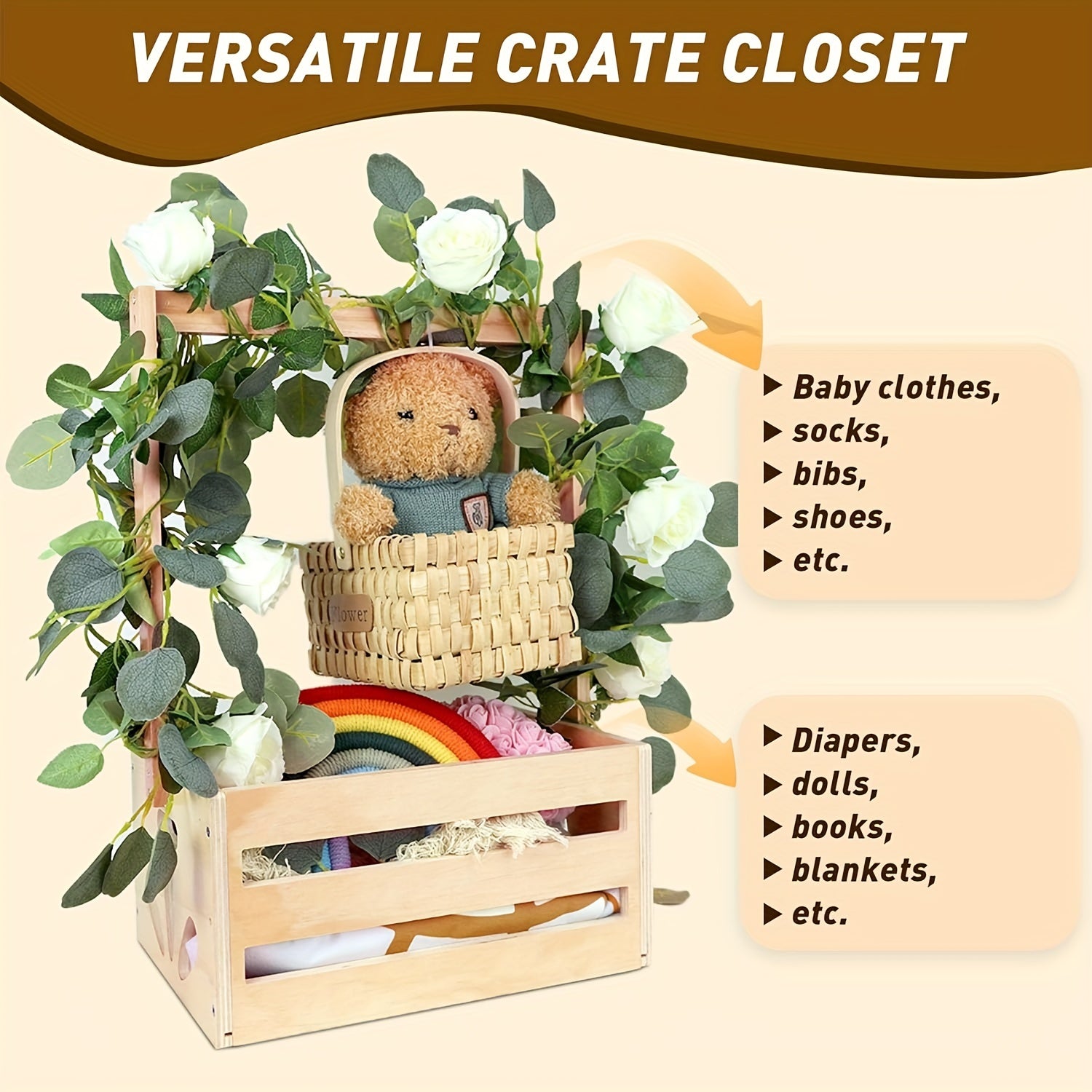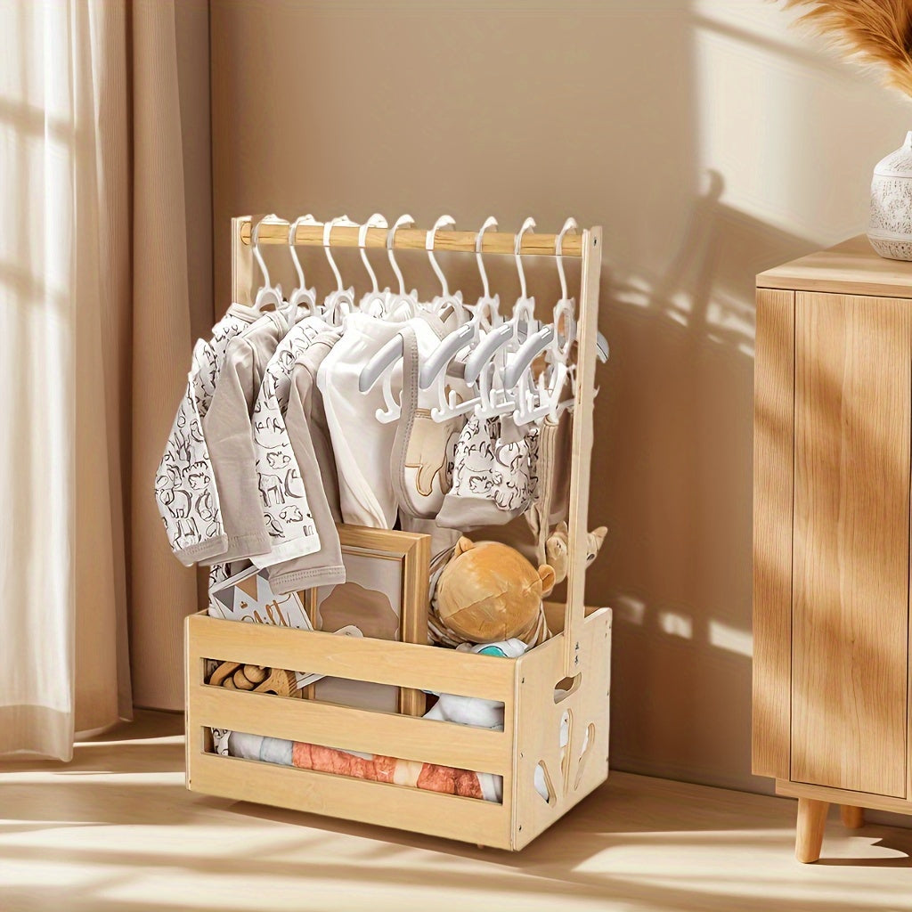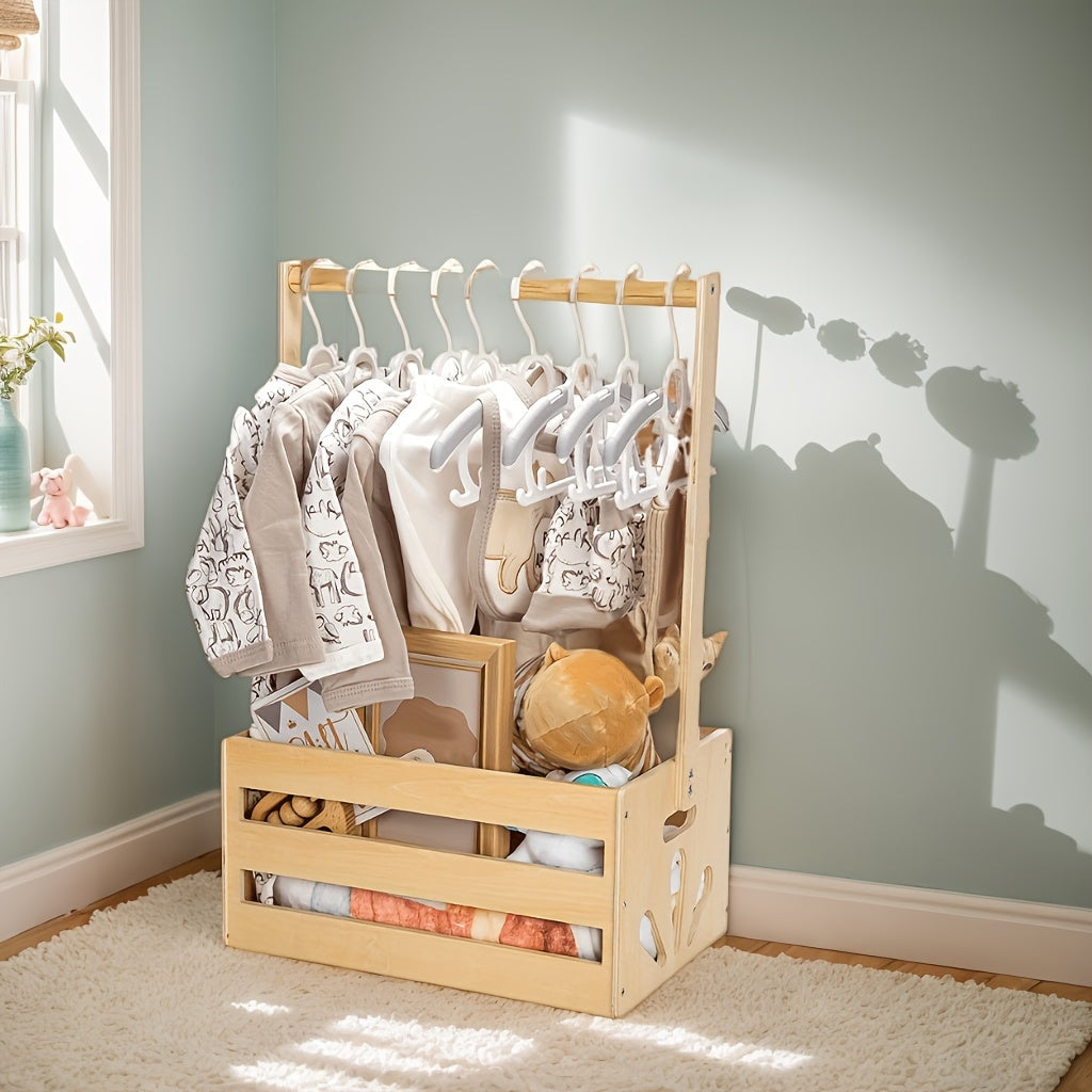 Bolalar xonasida, yotoqxona yoki o'yin xonasida o'yinchoqlar va kiyimlarni saqlash uchun osma tokchali sariq yog'och tashkilotchisi.