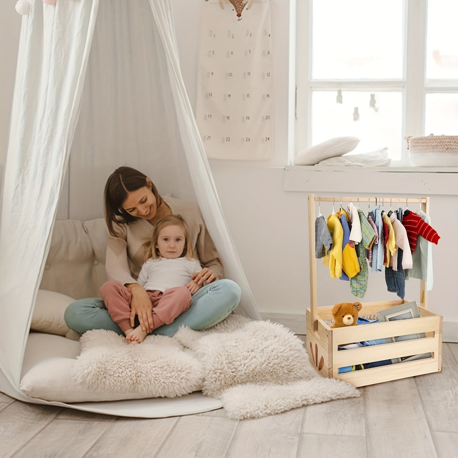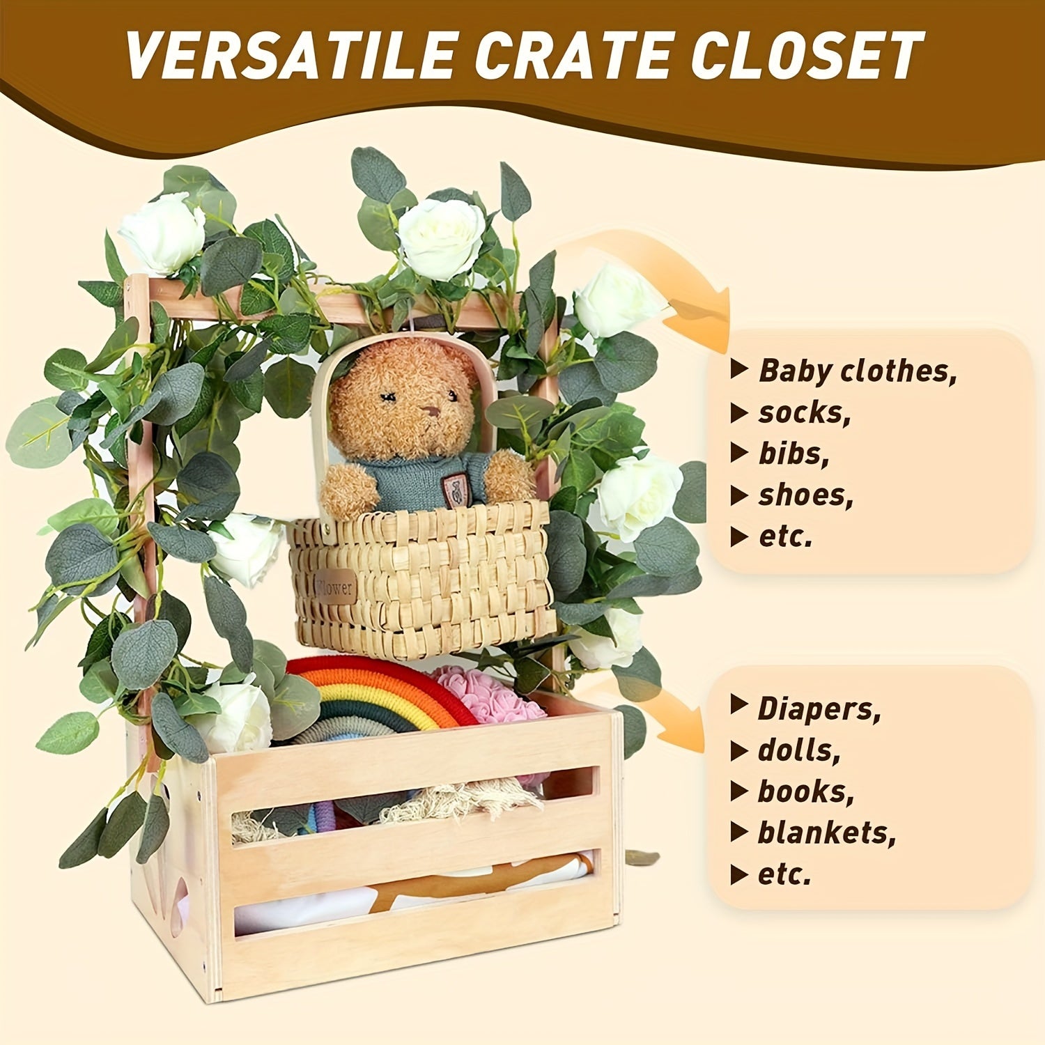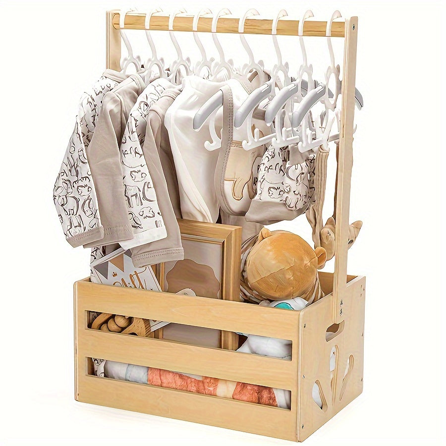 Bolalar xonasi shkafi uchun osma tayoq bilan sariq yog'och saqlash tashkilotchisi. Kiyimlar, o'yinchoqlar va pamperslarni ushlab turishi mumkin. Har tomonlama foydalanish mumkin bo'lgan to'rtburchak savat, sovg'a sifatida ideal.