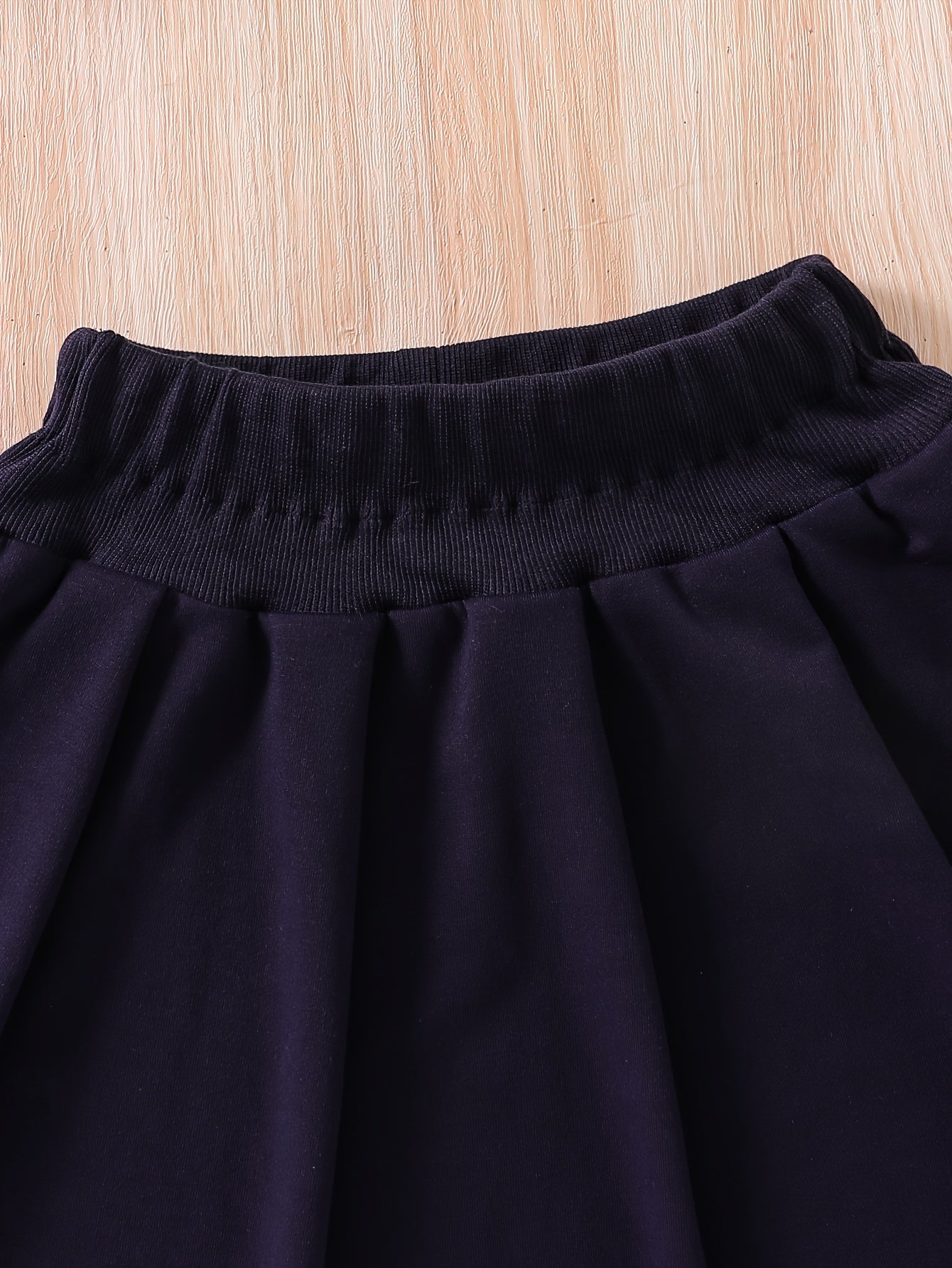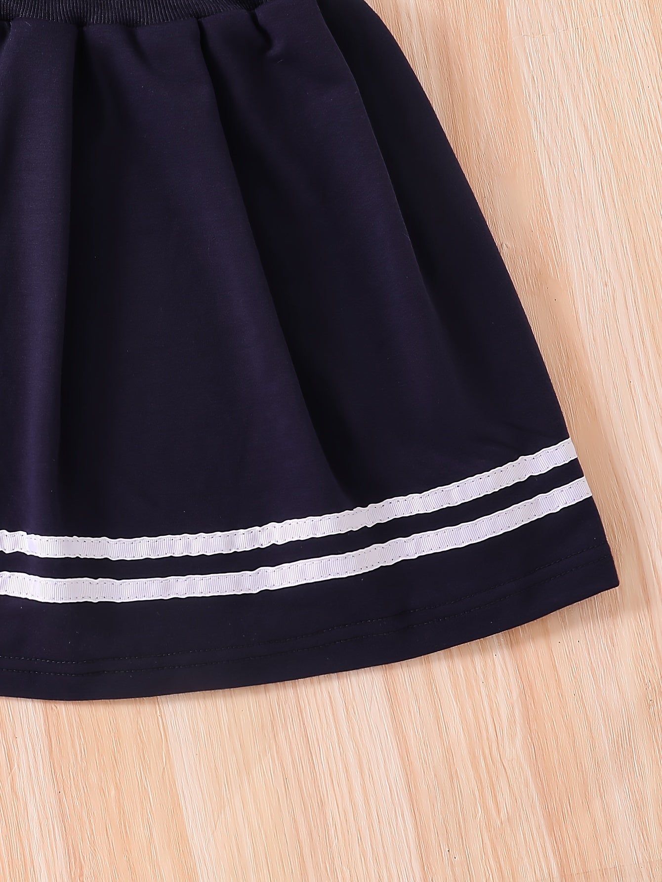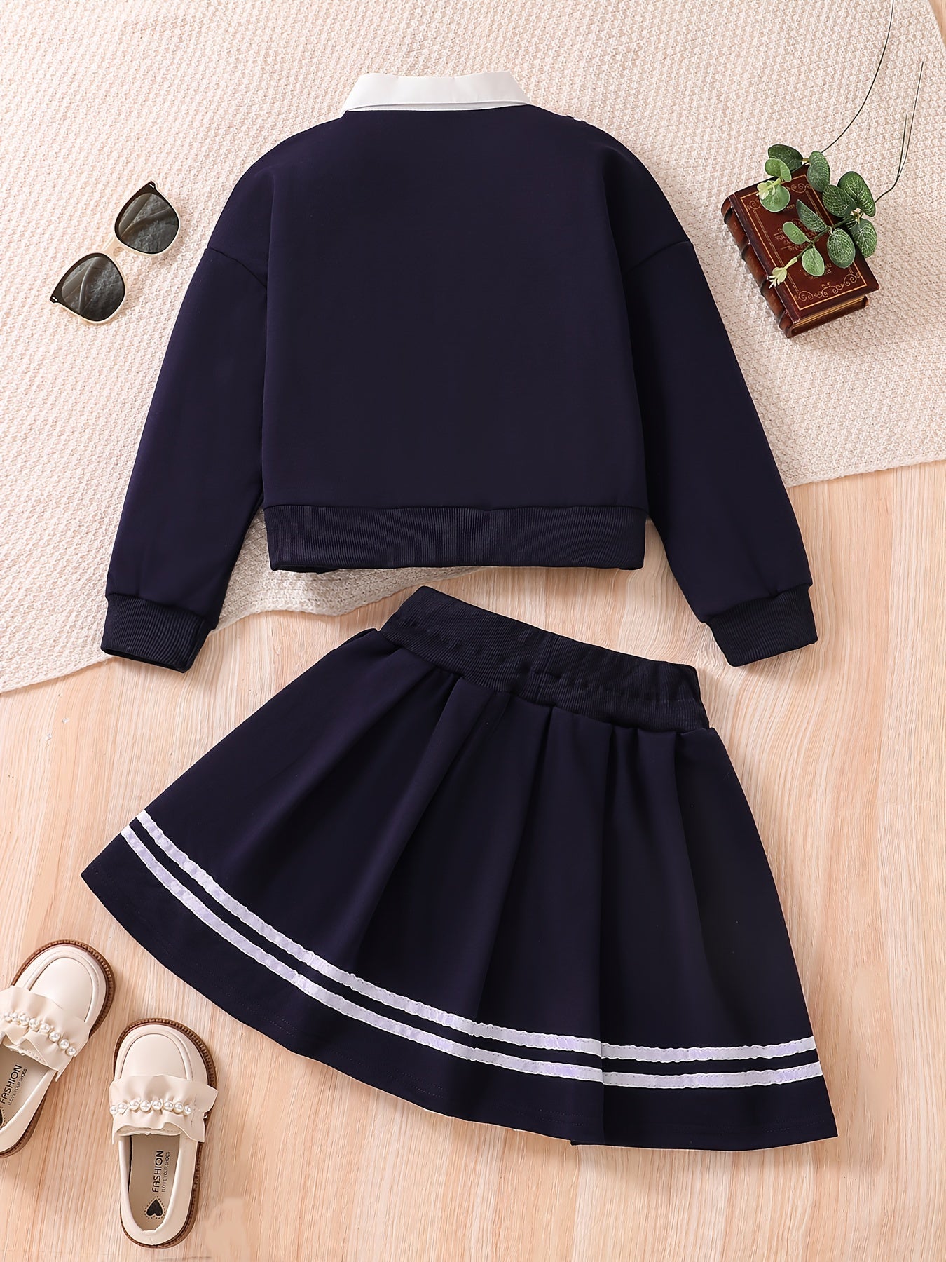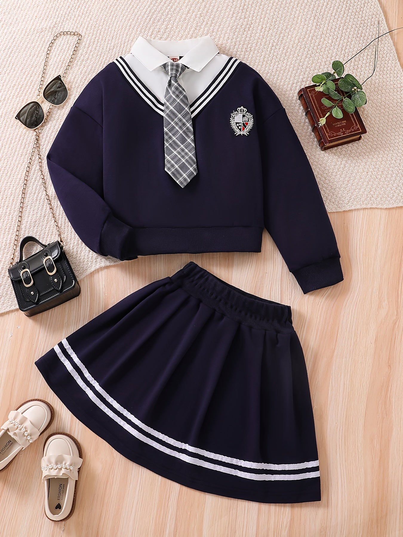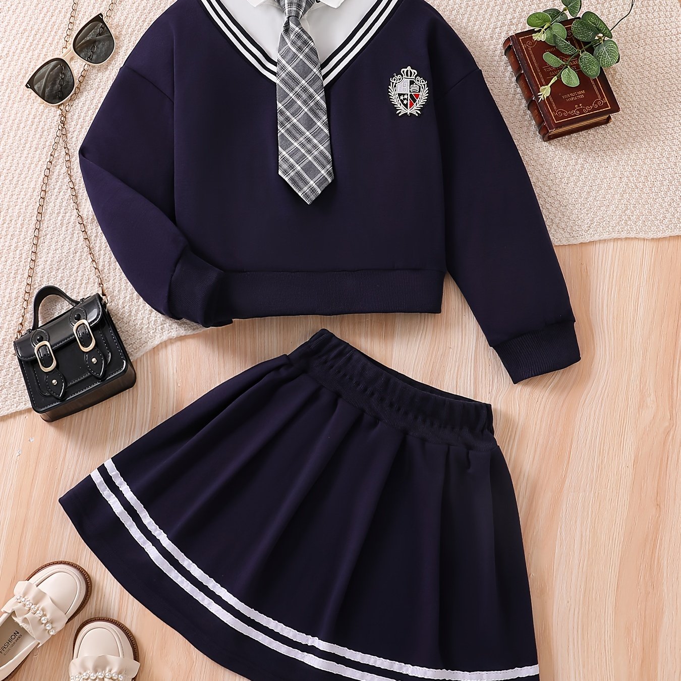 Yosh qizning kampus uslubidagi ikki qismli to'plami: Qisqa keng sviter ko'ylagi + bog'ichli chiziqli pliseli yubka.